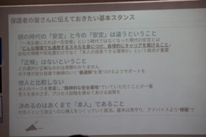 11月2日(日) (株)静岡新聞社 キャリアコンサルタント(国家資格)の瀧ゆみ子氏をお招きして保護者進路勉強会が開催されました。就職・進路について、親の時代とは違い正解はないので、生徒が興味があり納得できる進路に進むことが大切。保護者は生徒の話を傾聴して欲しいとのことです。