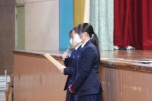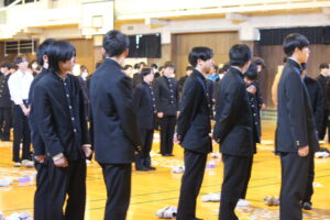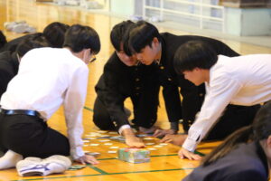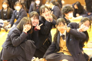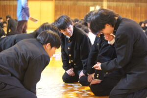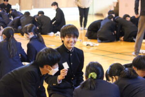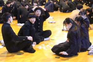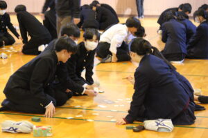 2月19日(木) 1年生が講堂で百人一首のチーム戦を行いました。上の句を聞きながら取り札を一生懸命に探す姿が見られました。ようやく取れて嬉しそうにする生徒や、終了後に取れた枚数を報告しあう様子が見られました。