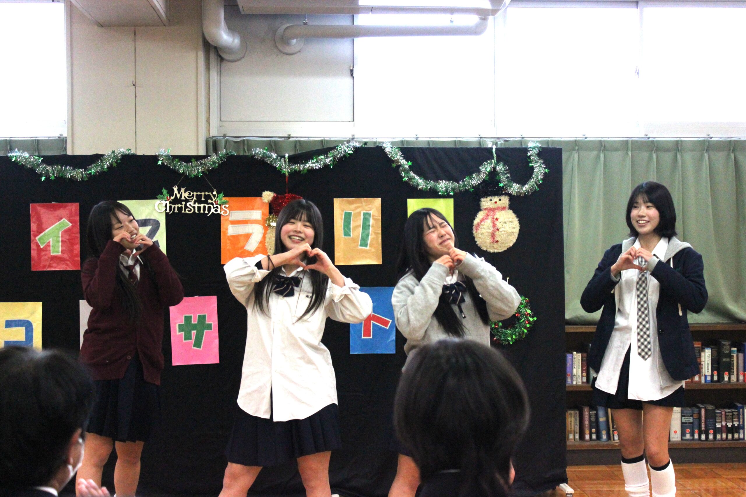 12月15日(月) クリスマスを前に図書室でライブラリーコンサートがありました。有志4名の元気なダンスで始まり、絵本の朗読、本の紹介と吹奏楽部の演奏が行われました。いつも静かな図書室も今日は賑やかな雰囲気でした。