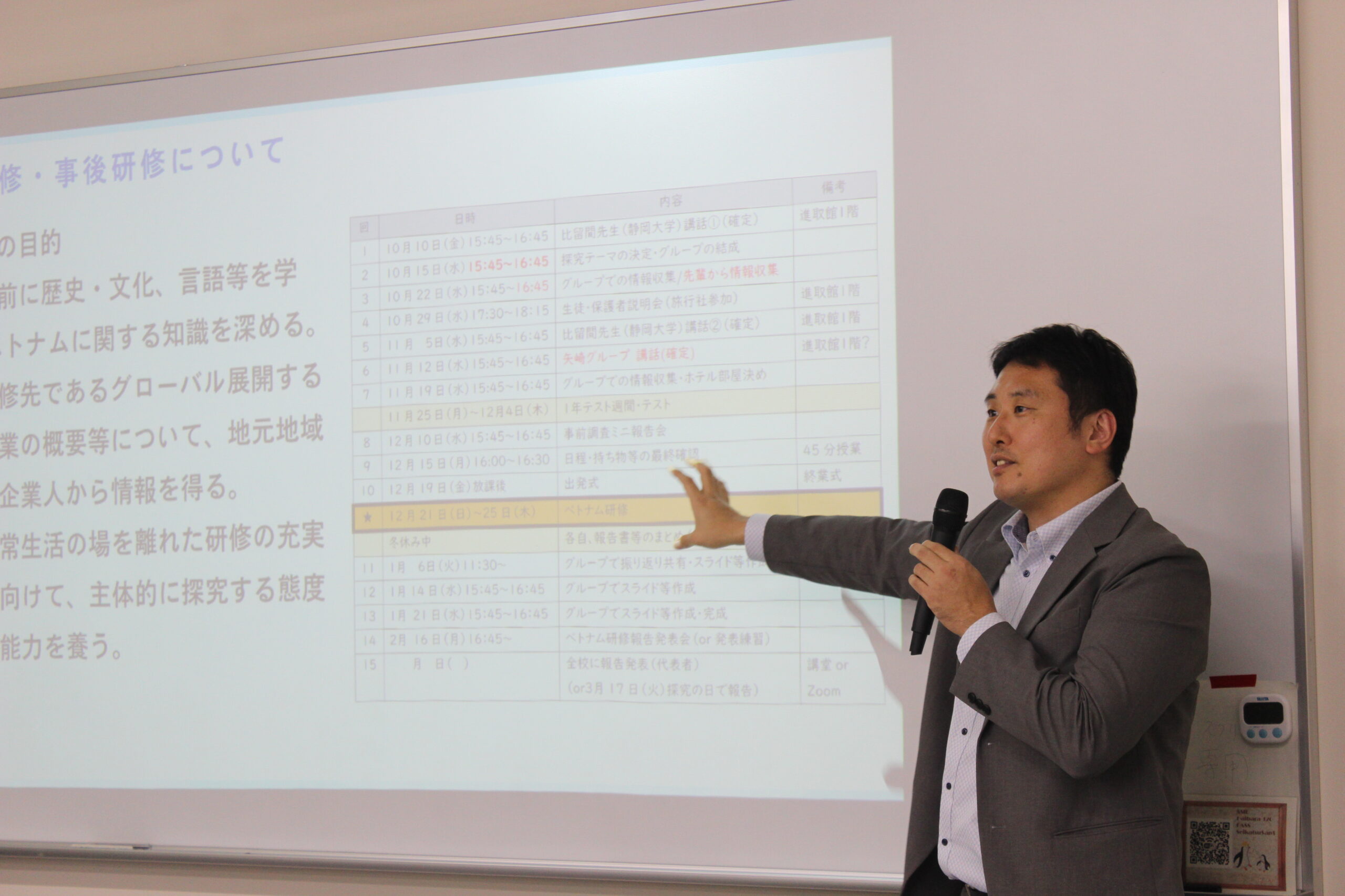 11月5日(水) ベトナム事前研修 静岡大学 比留間洋一先生の2回目の来校です。前半は比留間先生の講義、後半は生徒からプレゼンが行われました。「ベトナムの人の流行の髪型を知りたい」など比留間先生が面白いと言ってくださるプ …