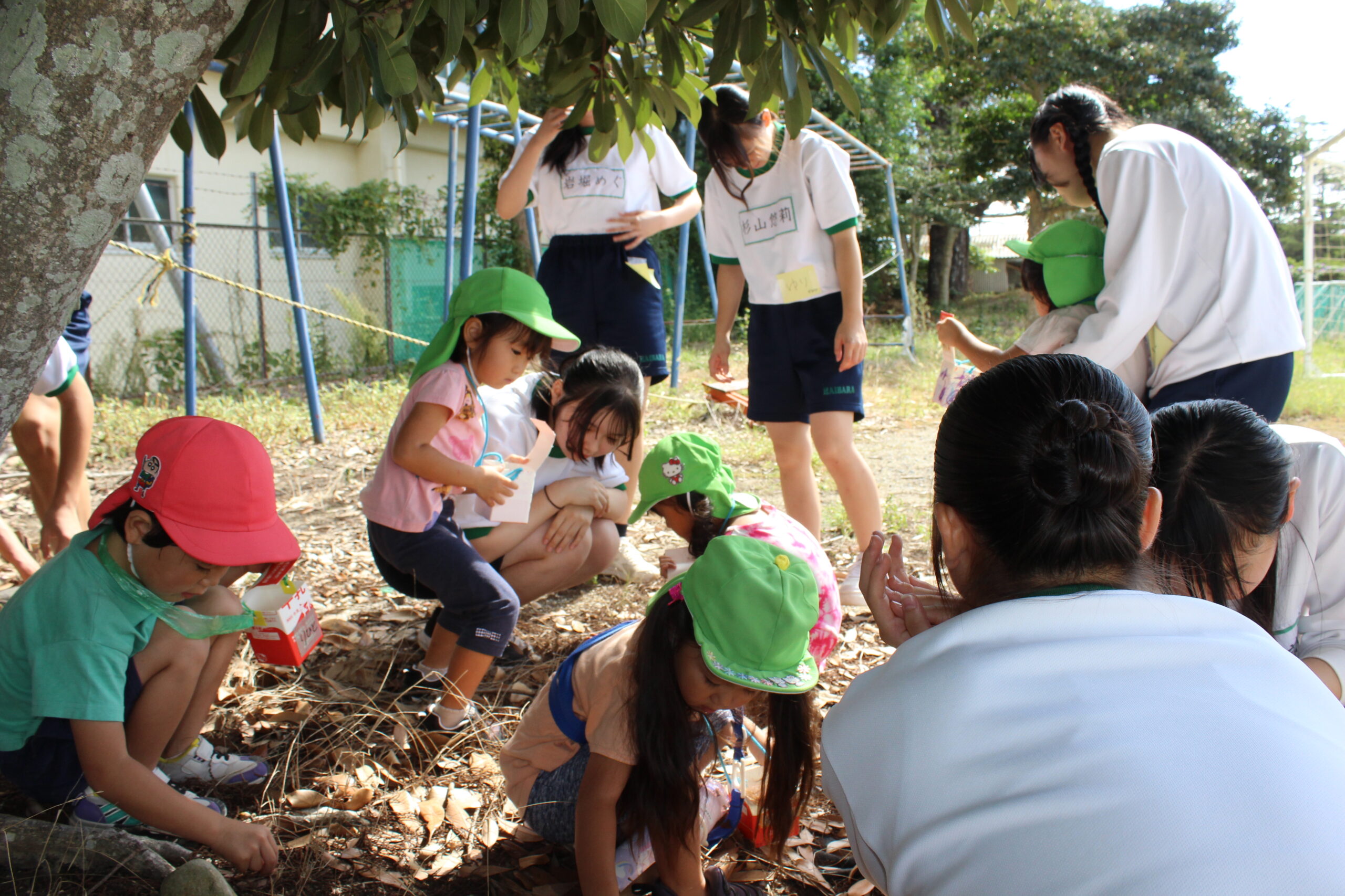 10月6日(月) 静波保育園の幼児が60人ほど来校しました。幼稚園教諭・保育士の仕事について学ぶため、21・22HRの生徒がグラウンドでどんぐりひろいやボール遊びをして子供達とふれあいました。 高校生が園児にやさしく声を …